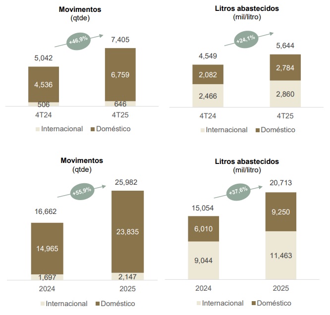 Para o ano de 2025, em relação a 2024, os crescimentos de movimento e litros abastecidos foram de 55,9% e 37,6%, respectivamente.